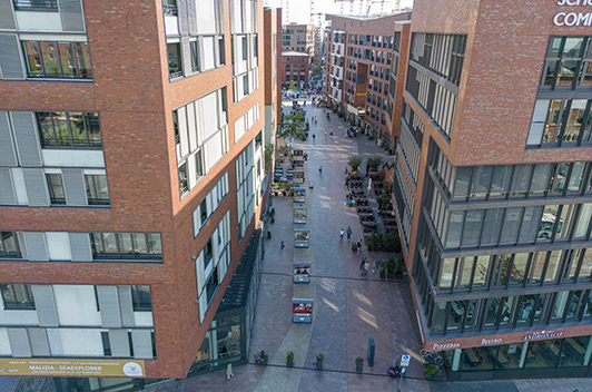 Der Überseeboulevard ist eine „Lebensader“ der HafenCity, eine Flaniermeile welche sich quer durch das neue Quartier schlängelt und an dessen Rand sich zahlreiche Geschäfte befinden.