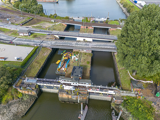 Um ihre Aufgaben auch zukünftig zuverlässig erfüllen zu können, baut die HPA nun an gleicher Stelle eine Ein-Kammer-Schleuse. Zudem werden auch die vier über die Schleuse führenden Straßenbrücken abgebrochen und durch einen Neubau ersetzt. Während der gesamten Bauzeit bleibt die Querung für den KFZ-Verkehr erhalten. Gleiches gilt für die vier Bahnbrücken, die ebenfalls nutzbar bleiben.