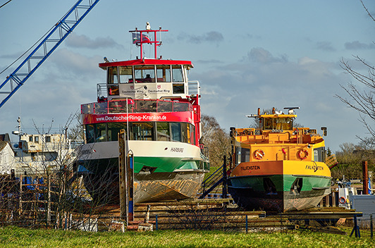 Auf der Marine Service Brandt Werft im Hafen Oortkaten werden u.a. die Hadag-Fähren repariert. Derzeit liegt dort die Fähre Oevelgoenne. Es können aber auch mehr Schiffe sein, die dort in den Service gehen.