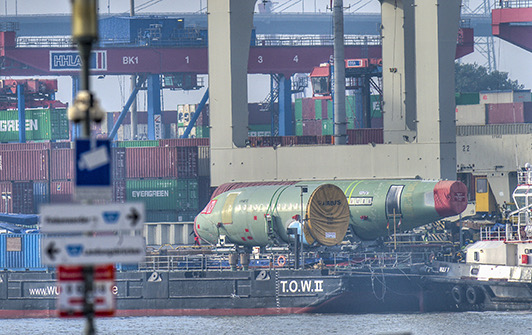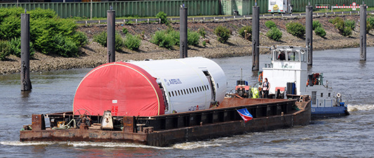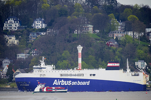 Airbus Finkenwerder in Hamburg transportiert vom Werk Finkenwerder mit dem Transportschiff Kugelbake zwei Airbus-Frontteile A320 zum Containerterminal Tollerort. Von dort geht es dann mit dem Containerschiff CSCL Mars nach China.