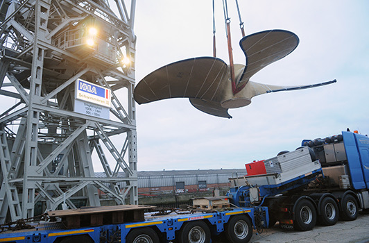 Hier werden gerade Schiffspropeller der Mecklenburger Metallguss aus Waaren an der Mueritz vom Schwertransport-Tieflader auf den HHLA Schwimmkran verladen, um die 70 und 76 Tonnen schweren Schiffsschrauben zum Weitertransport nach Korea und China zum Schuppen 86 zu bringen.
