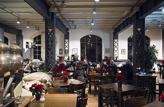 In unserem hauseigenen Rösterei-Café könnt ihr unsere frisch gerösteten Kaffee- und Espressospezialitäten auf über 250 qm Eichenholzdielen im Ambiente des alten Speicherbodens von 1888 genießen. Umgeben von zahlreichen, teils musealen Kaffeemühlen und Röstanlagen könnt ihr den Barkassen am rückseitigen Fleet zusehen oder dem Treiben in der Rösterei zuschauen.