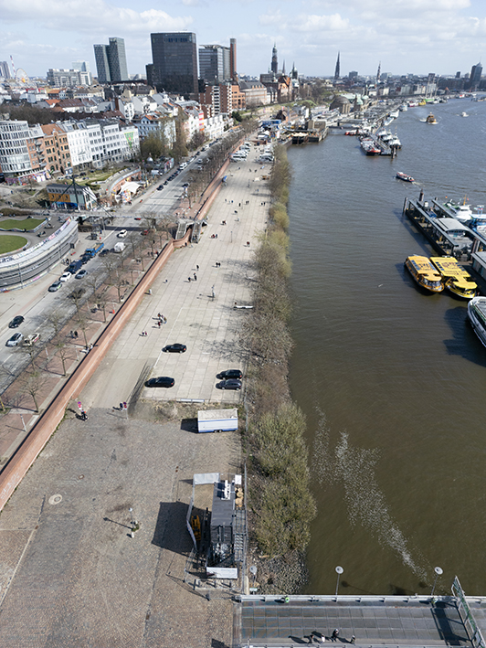 Der derzeit als Parkplatz für Wohnmobile genutzte Bereich an der St. Pauli Hafenkante in Hamburg wird umfassend umgestaltet und bis 2030 in eine grüne Freizeitfläche verwandelt.